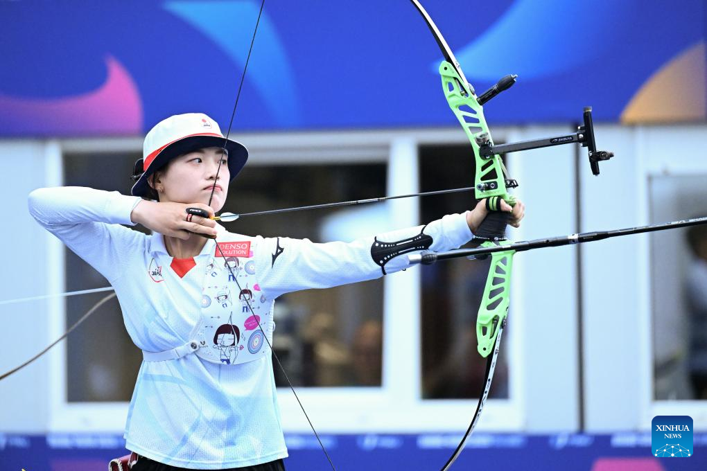 Sonoda Waka of Japan competes during the mixed recurve team gold medal match of archery between China and Japan at the Rhine-Ruhr 2025 FISU World University Games in Essen, Germany, July 25, 2025. (Xinhua/Lian Yi)