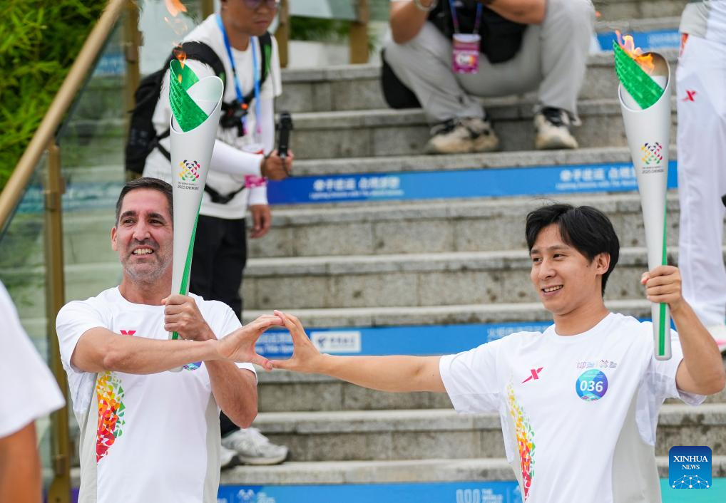 Torch bearers Han Cong (R) and James Edward Ayala pose for photos during the World Games 2025 Torch Relay in Chengdu, southwest China's Sichuan Province, on July 26, 2025. (Xinhua/Tenzin Nyida)