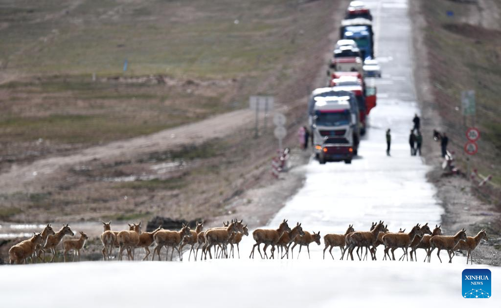 XINING, July 25 (Xinhua) -- In the early summer, drivers on a stretch of National Highway 109 in the Yushu Tibetan Autonomous Prefecture of northwest China's Qinghai Province often encounter a unique spectacle: herds of Tibetan antelopes crossing the busy road.