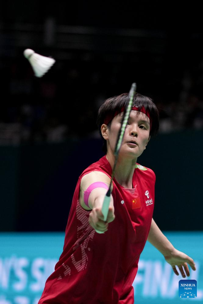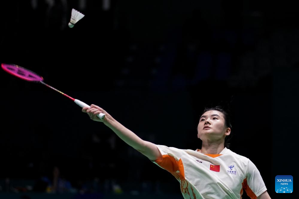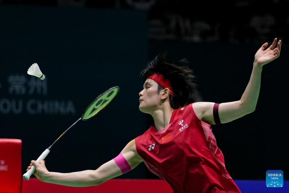Han Yue of China competes during the women's singles final match between Wang Zhiyi of China and Han Yue of China at the China Open 2025 badminton tournament in Changzhou, east China's Jiangsu Province, July 27, 2025. (Xinhua/Li Bo)