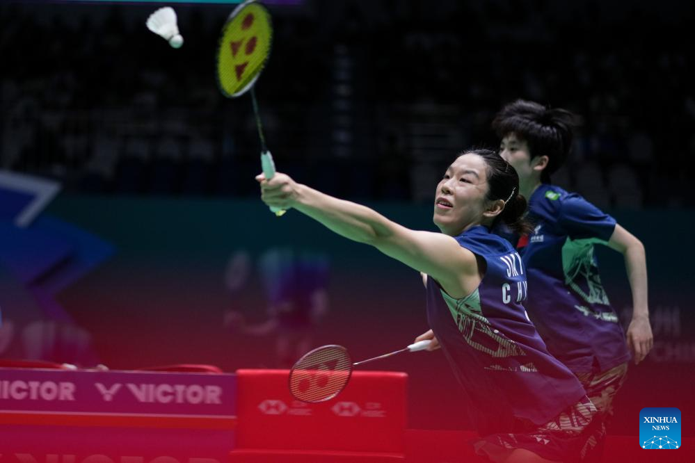 Jia Yifan (front) /Zhang Shuxian of China compete during the women's doubles final match between Liu Shengshu/Tan Ning of China and Jia Yifan/Zhang Shuxian of China at the China Open 2025 badminton tournament in Changzhou, east China's Jiangsu Province, July 27, 2025. (Xinhua/Li Bo)