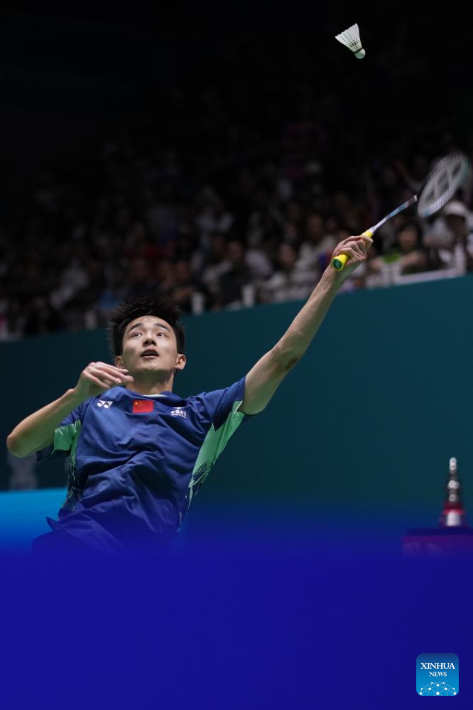 Wang Zhengxing of China competes during the men's singles final match between Shi Yuqi of China and Wang Zhengxing of China at the China Open 2025 badminton tournament in Changzhou, east China's Jiangsu Province, July 27, 2025. (Xinhua/Li Bo)