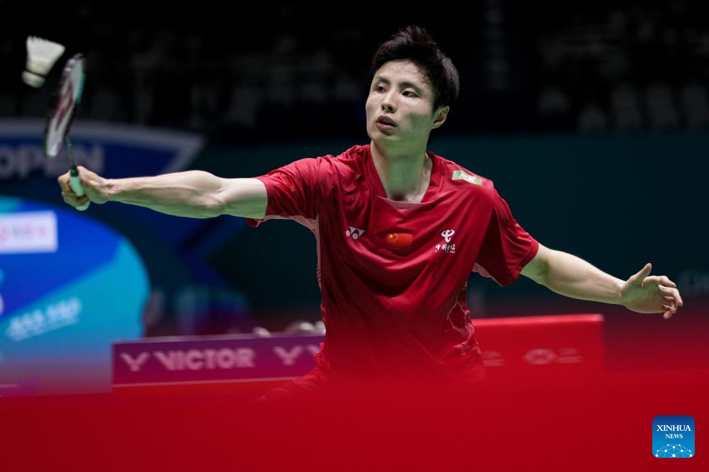 Shi Yuqi of China competes during the men's singles final match between Shi Yuqi of China and Wang Zhengxing of China at the China Open 2025 badminton tournament in Changzhou, east China's Jiangsu Province, July 27, 2025. (Xinhua/Li Bo)