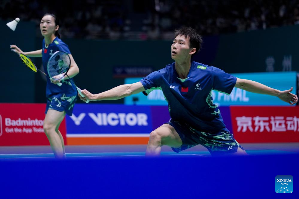 Jiang Zhenbang/Wei Yaxin (front) of China compete during the mixed doubles final between Feng Yanzhe/Huang Dongping of China and Jiang Zhenbang/Wei Yaxin of China at the China Open 2025 badminton tournament in Changzhou, east China's Jiangsu Province, July 27, 2025. (Xinhua/Li Bo)