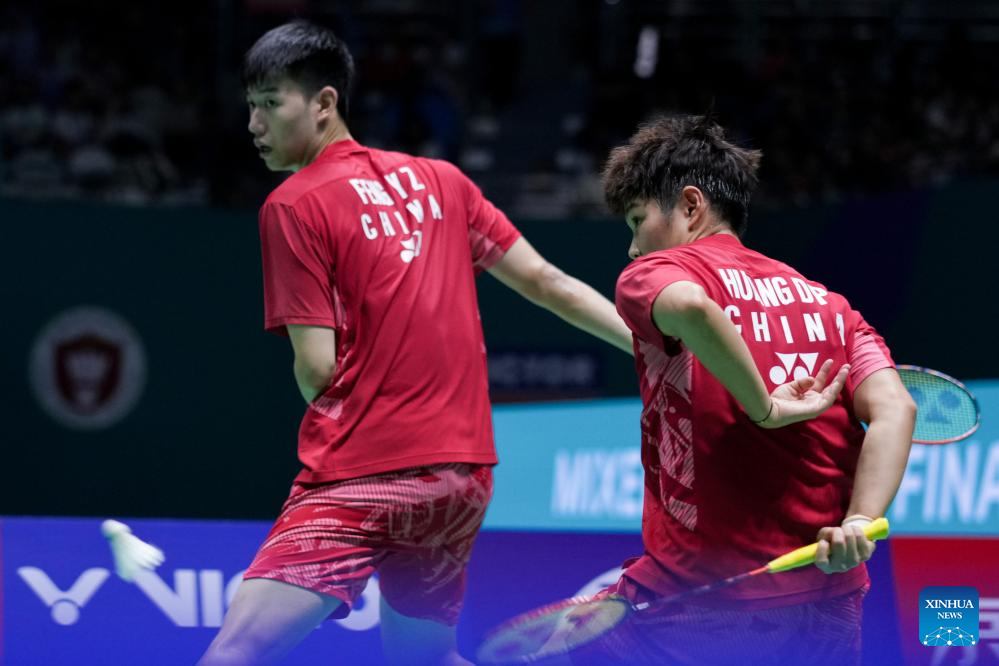 Feng Yanzhe/Huang Dongping (R) of China compete during the mixed doubles final between Feng Yanzhe/Huang Dongping of China and Jiang Zhenbang/Wei Yaxin of China at the China Open 2025 badminton tournament in Changzhou, east China's Jiangsu Province, July 27, 2025. (Xinhua/Li Bo)