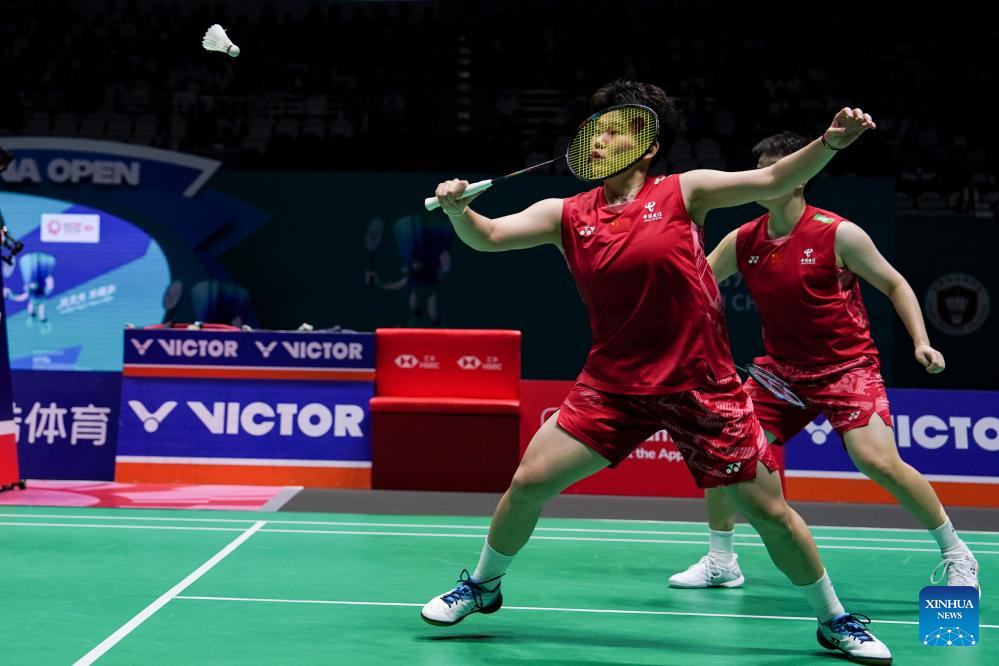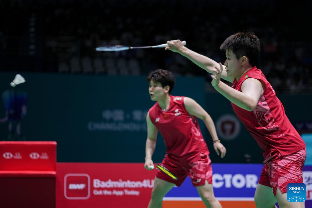 Liu Shengshu (R)/Tan Ning of China compete during the women's doubles final match between Liu Shengshu/Tan Ning of China and Jia Yifan/Zhang Shuxian of China at the China Open 2025 badminton tournament in Changzhou, east China's Jiangsu Province, July 27, 2025. (Xinhua/Li Bo)