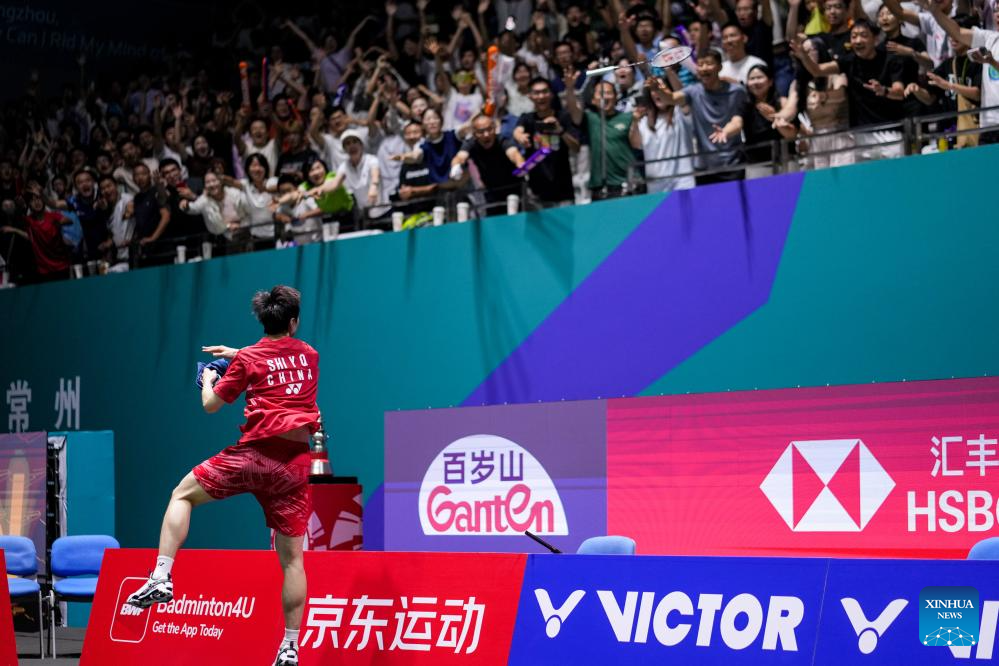 Shi Yuqi of China reacts with the audience after the men's singles final match between Shi Yuqi of China and Wang Zhengxing of China at the China Open 2025 badminton tournament in Changzhou, east China's Jiangsu Province, July 27, 2025. (Xinhua/Li Bo)