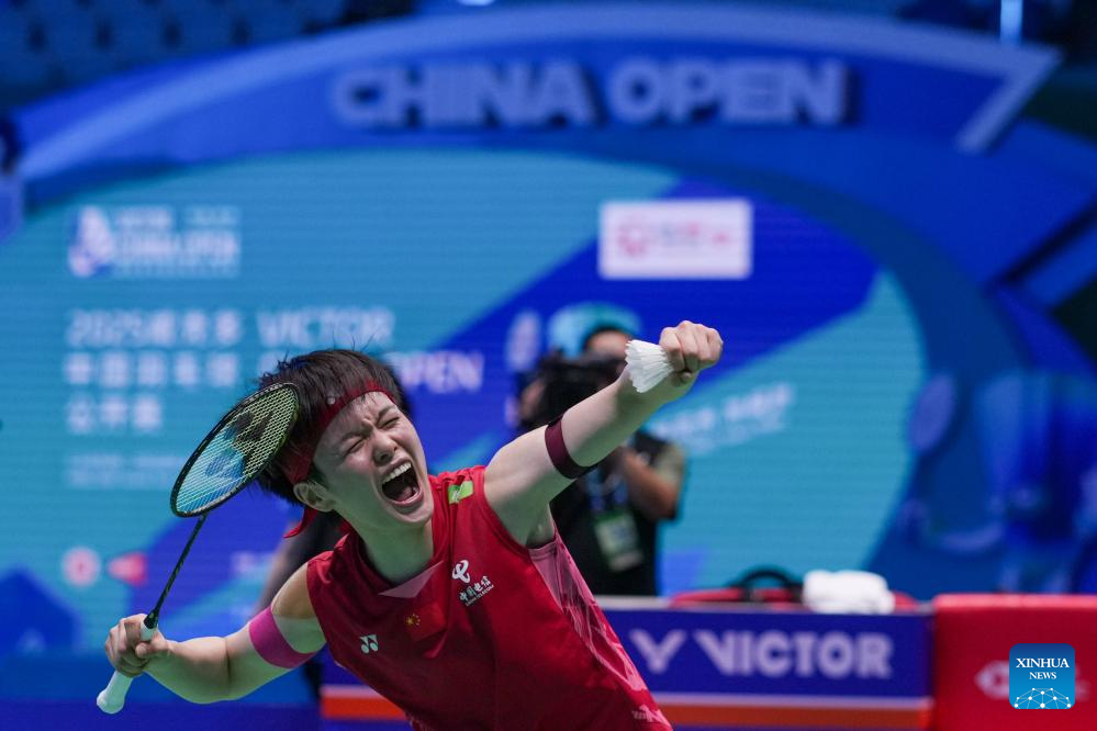 Wang Zhiyi of China celebrates after the women's singles final match between Wang Zhiyi of China and Han Yue of China at the China Open 2025 badminton tournament in Changzhou, east China's Jiangsu Province, July 27, 2025. (Xinhua/Li Bo)