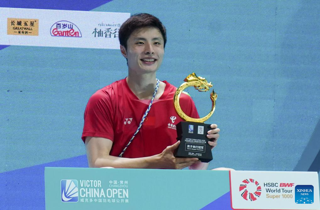 Shi Yuqi of China poses for photos during the awarding ceremony for the men's singles match between Shi Yuqi of China and Wang Zhengxing of China at the China Open 2025 badminton tournament in Changzhou, east China's Jiangsu Province, July 27, 2025. (Photo by Liu Zhenrui/Xinhua)