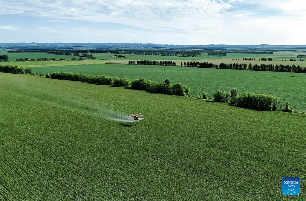 An agricultural aircraft flies above a soybean field at the Beidahuang Group Heilongjiang Hongxing Farm in Bei'an City, northeast China's Heilongjiang Province, July 25, 2025. Aerial crop protection operations have commenced across various agricultural production units of the Beidahuang Group, covering more than 30 million mu (about 2 million hectares) of dry farmlands. (Photo by Hou Yue/Xinhua)