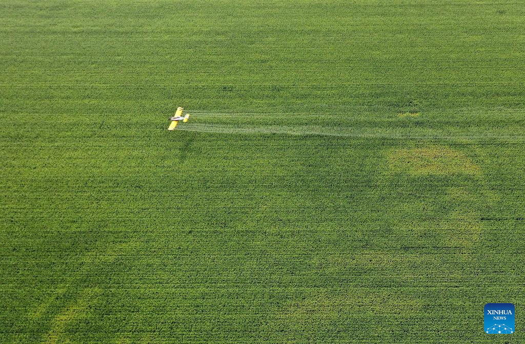 An aerial drone photo taken on July 25, 2025 shows an agricultural aircraft flying above a soybean field at the Beidahuang Group Heilongjiang Hongxing Farm in Bei'an, northeast China's Heilongjiang Province. Aerial crop protection operations have commenced across various agricultural production units of the Beidahuang Group, covering more than 30 million mu (about 2 million hectares) of dry farmlands. (Photo by Hou Yue/Xinhua)