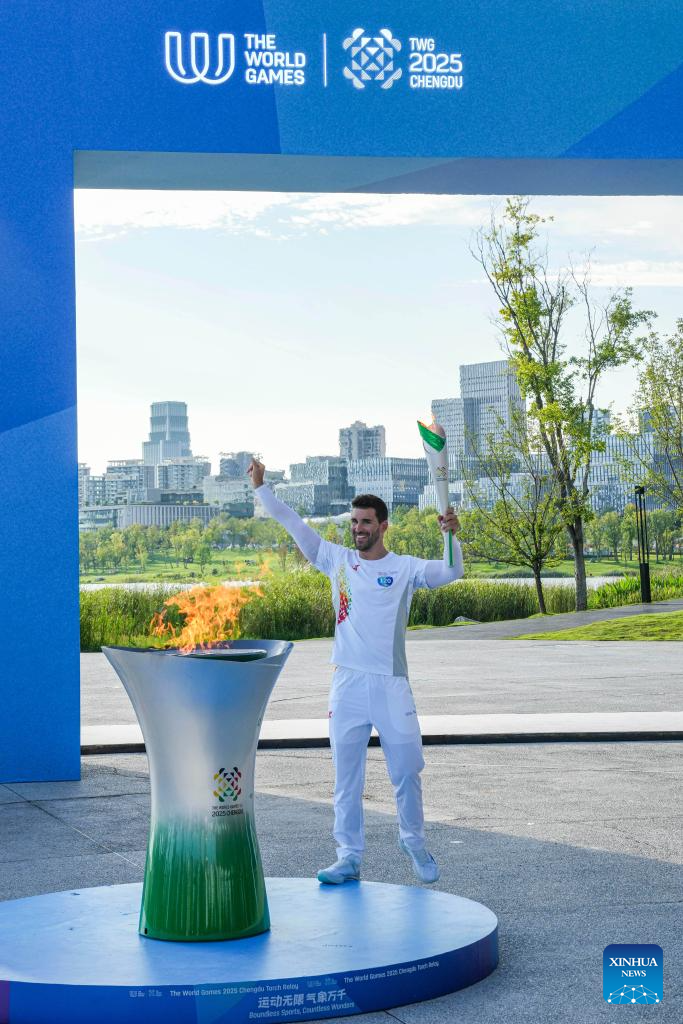 Torch bearer Marcel Hassemeier holds the torch during the World Games 2025 Torch Relay in Chengdu, southwest China's Sichuan Province, July 26, 2025. (Xinhua/Ding Zengnida)