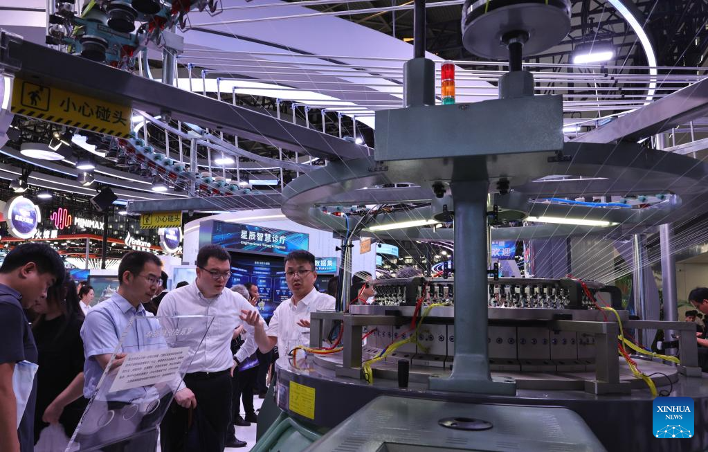 People view an AI-powered textile machine at the exhibition area of the 2025 World AI Conference and High-Level Meeting on Global AI Governance in east China's Shanghai, July 26, 2025. The event kicked off here on Saturday. More than 1,000 officials and representatives of industries, universities and research institutes from home and abroad attended the opening ceremony. (Xinhua/Fang Zhe)