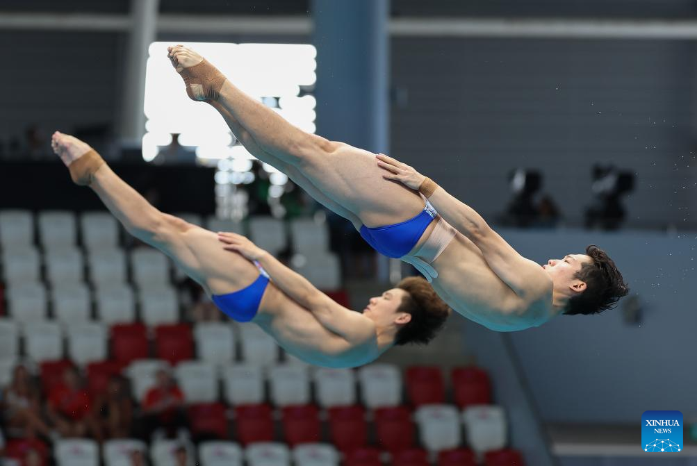 Wang Zongyuan/Zheng Jiuyuan of China compete during the men's 3m synchronised final of diving at the World Aquatics Championships in Singapore, July 28, 2025. (Xinhua/Luo Yuan)