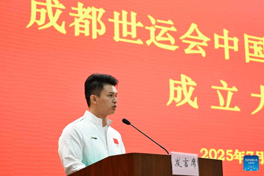 Zhong Qixin, head coach of China's sport climbing team, delivers a speech at the Chinese delegation's launch ceremony for the upcoming 2025 Chengdu World Games in Beijing, capital of China, July 29, 2025. China unveiled a 489-member delegation, including 321 athletes. The team will compete in 152 events across 28 sports, marking China's largest participation in the history of the Games. (Xinhua/Song Yanhua)