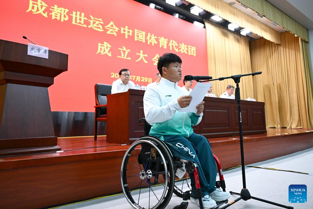 Ai Xinliang, a para archer, delivers a speech at the Chinese delegation's launch ceremony for the upcoming 2025 Chengdu World Games in Beijing, capital of China, July 29, 2025. China unveiled a 489-member delegation, including 321 athletes. The team will compete in 152 events across 28 sports, marking China's largest participation in the history of the Games. (Xinhua/Song Yanhua)