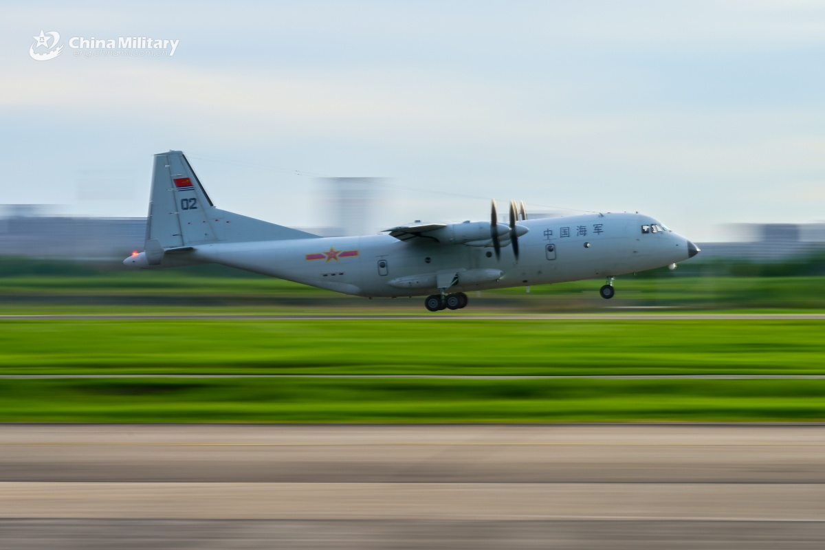 A Y-9 transport aircraft attached to an aviation unit under the Chinese PLA Navy takes off for the designated airspace during a flight training exercise on July 15, 2025. (eng.chinamil.com.cn/Photo by Wang Haojing)
