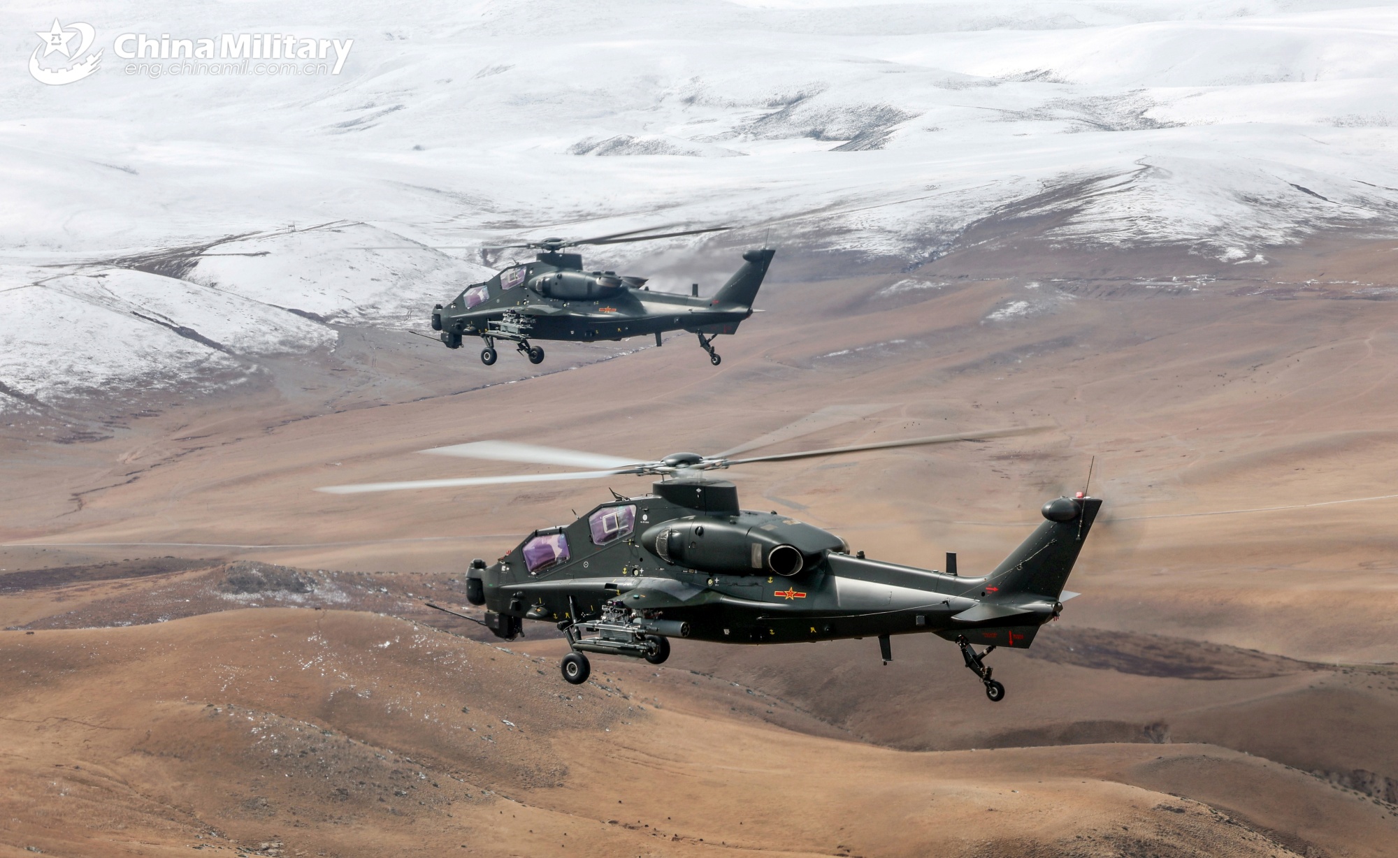WZ-10 attack helicopters attached to a brigade under the Chinese PLA Xizang Military Command fly in formation during a flight training exercise on July 3, 2025. (eng.chinamil.com.cn/Photo by Hu Qiwu)