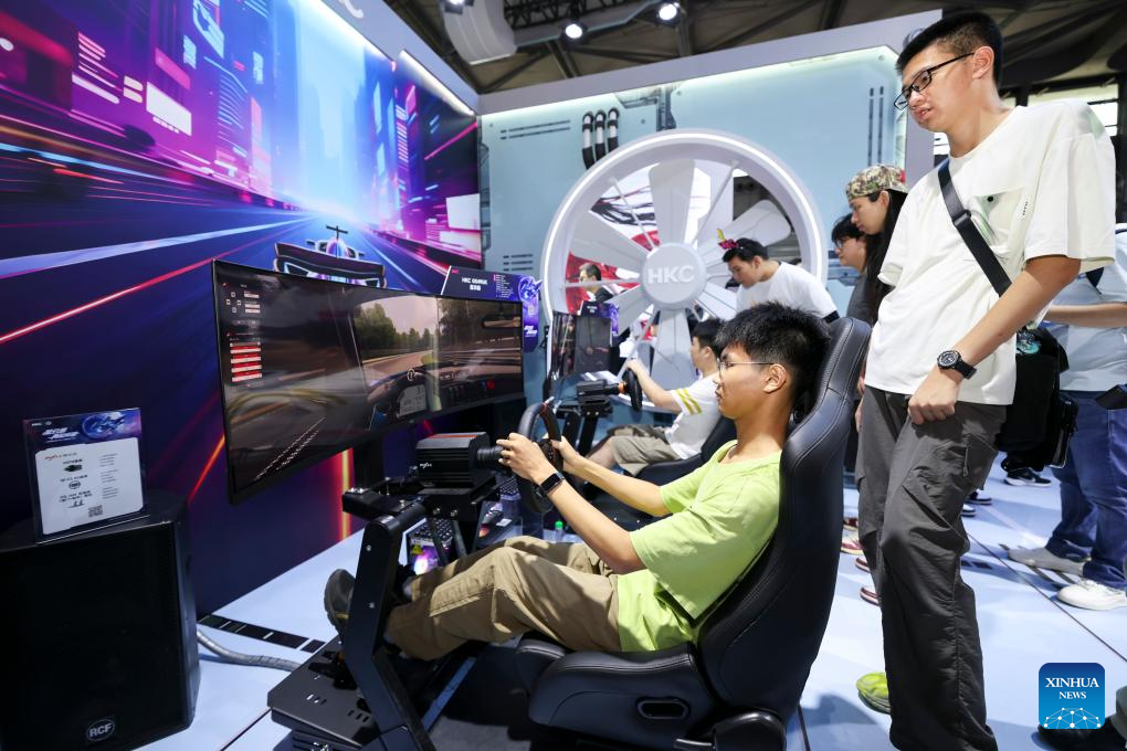 A visitor experiences racing game at ChinaJoy 2025 in Shanghai, east China, Aug. 1, 2025. The 22nd China Digital Entertainment Expo and Conference (ChinaJoy 2025) kicked off in Shanghai on Friday, bringing together over 743 exhibitors from 37 countries and regions worldwide. (Xinhua/Wang Xiang)