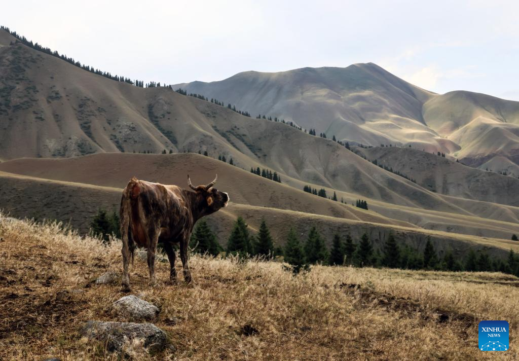 A herd of cattle is pictured at a scenic spot in Wusu City, northwest China's Xinjiang Uygur Autonomous Region, July 29, 2025. In recent days, multiple areas in Xinjiang have experienced sustained high temperatures, prompting residents and tourists to seek relief in cooler scenic spots.