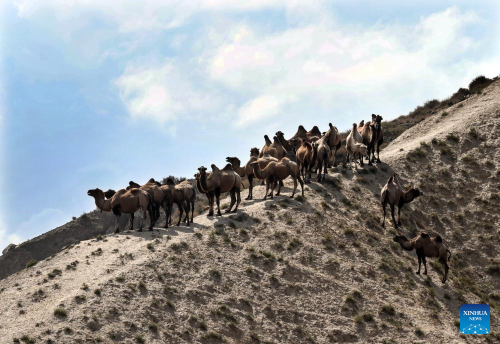 A herd of camels is pictured at a scenic spot in Wusu City, northwest China's Xinjiang Uygur Autonomous Region, July 29, 2025. In recent days, multiple areas in Xinjiang have experienced sustained high temperatures, prompting residents and tourists to seek relief in cooler scenic spots.