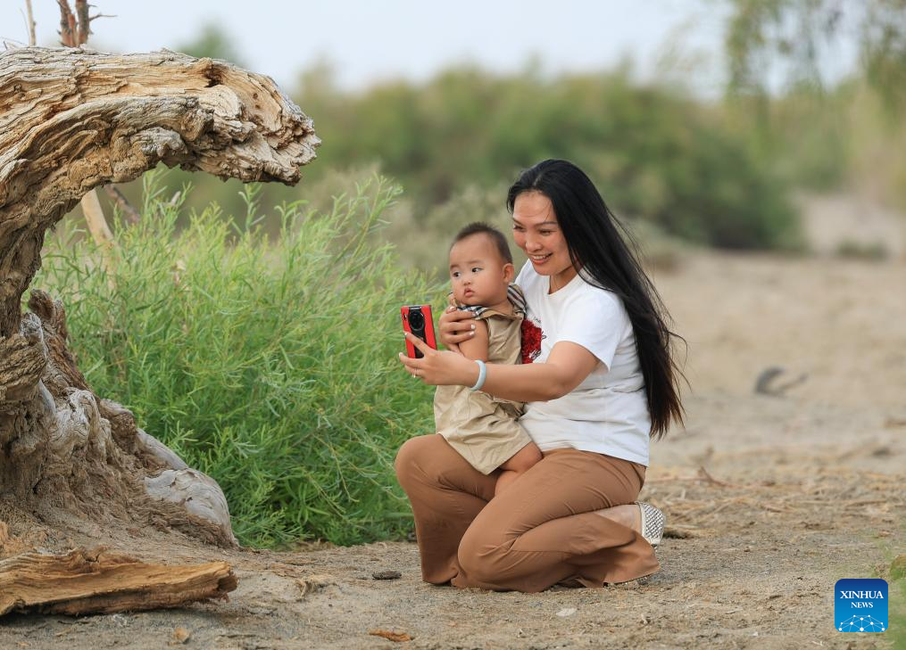 Tourists visit a poplar scenic area in Wusu City, northwest China's Xinjiang Uygur Autonomous Region, July 29, 2025. In recent days, multiple areas in Xinjiang have experienced sustained high temperatures, prompting residents and tourists to seek relief in cooler scenic spots.
