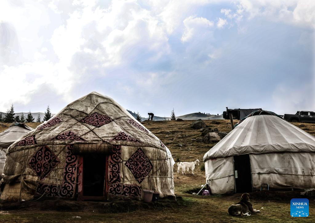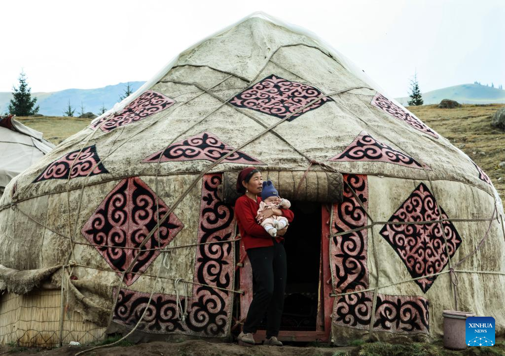 A woman holding a child is pictured in front of a yurt in Wusu City, northwest China's Xinjiang Uygur Autonomous Region, July 29, 2025. In recent days, multiple areas in Xinjiang have experienced sustained high temperatures, prompting residents and tourists to seek relief in cooler scenic spots.
