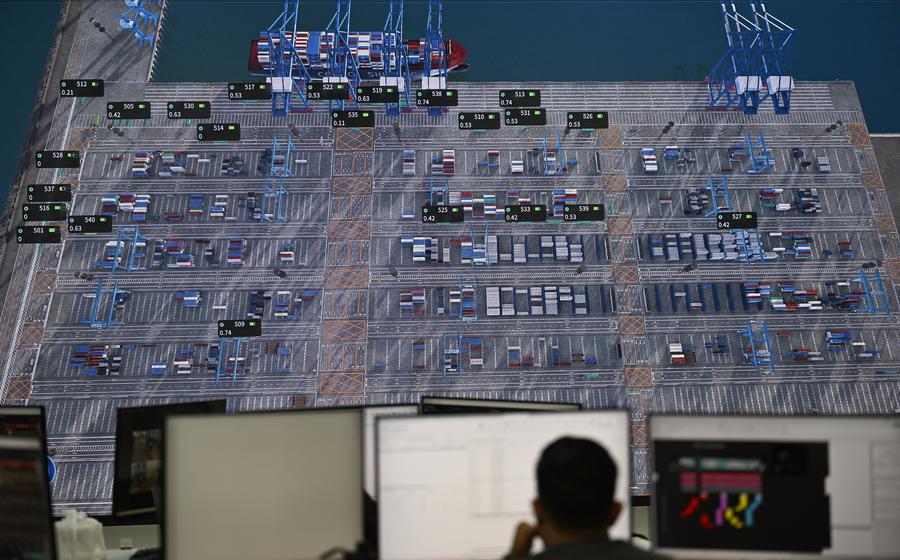 A staff member monitors the operation of Chancay Port in the operation center of COSCO Shipping Ports Chancay Peru, in Chancay, Peru, May 16, 2025. (Xinhua/Li Muzi)