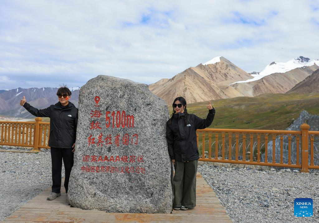 People pose for photos at the Khunjerab Pass, a land port on the China-Pakistan border, in Tajik Autonomous County of Taxkorgan, northwest China's Xinjiang Uygur Autonomous Region, Aug. 2, 2025. Tajik Autonomous County of Taxkorgan has entered the peak travel season as more tourists come here to experience the culture and enjoy the scenery on the plateau. (Xinhua/Wang Fei)