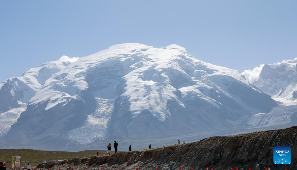 People visit the Muztagata glacier park in Tajik Autonomous County of Taxkorgan, northwest China's Xinjiang Uygur Autonomous Region, Aug. 3, 2025. Tajik Autonomous County of Taxkorgan has entered the peak travel season as more tourists come here to experience the culture and enjoy the scenery on the plateau. (Xinhua/Wang Fei)
