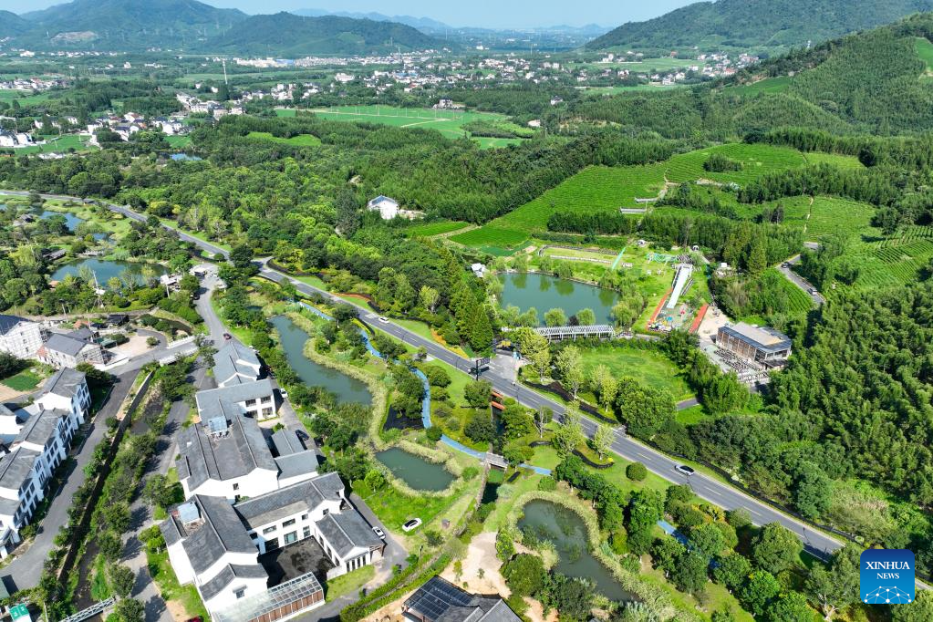 An aerial drone photo taken on Aug. 5, 2025 shows a view of Jingshan Village in Yuhang District of Hangzhou City, east China's Zhejiang Province. Jingshan Village, located in Yuhang District of Hangzhou City, east China's Zhejiang Province, is celebrated for its top-notch forest coverage rate of over 96 percent.