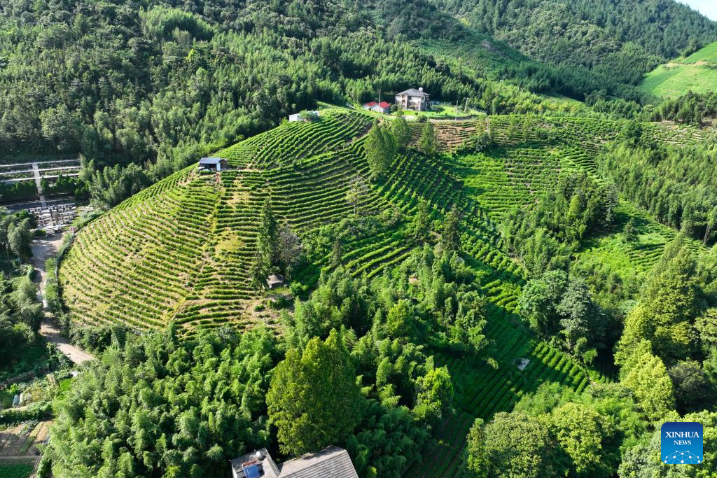 An aerial drone photo taken on Aug. 5, 2025 shows a tea hill at Jingshan Village in Yuhang District of Hangzhou City, east China's Zhejiang Province. Jingshan Village, located in Yuhang District of Hangzhou City, east China's Zhejiang Province, is celebrated for its top-notch forest coverage rate of over 96 percent.