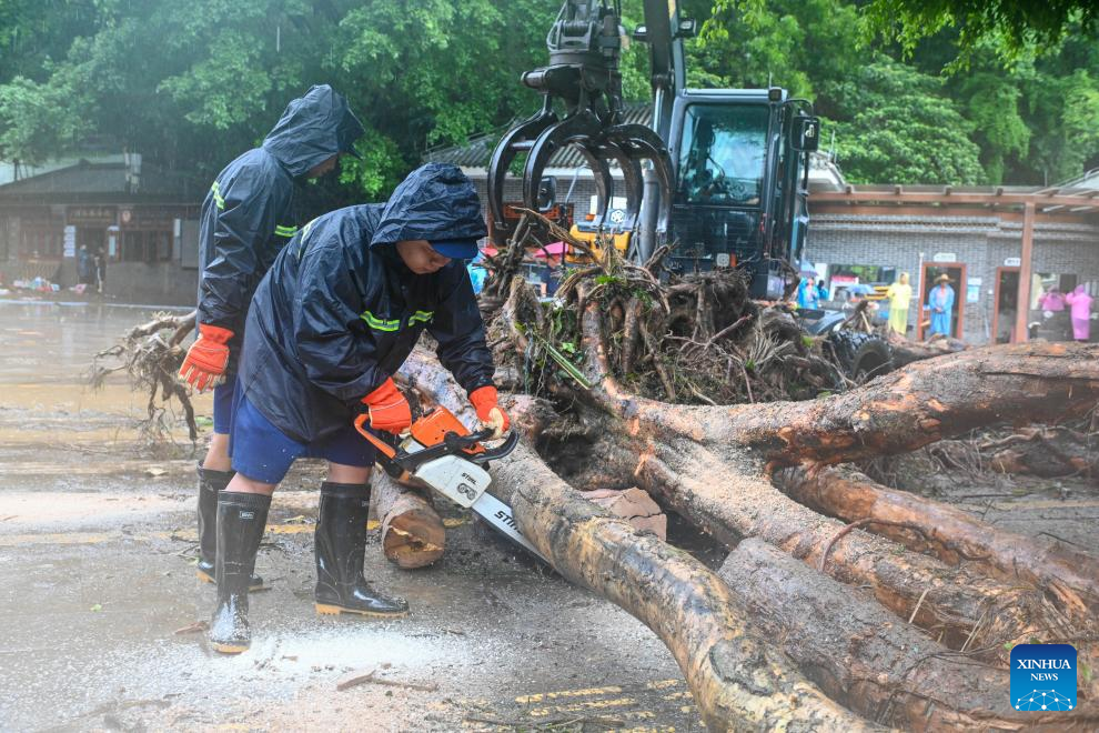 Staff members cut a flood-toppled tree with a chainsaw in Dinghu District of Zhaoqing City, south China's Guangdong Province, Aug. 6, 2025. China's national commission for disaster prevention, reduction and relief on Wednesday initiated a Level-IV emergency response in Guangdong Province due to heavy rainfall and severe flooding, according to the Ministry of Emergency Management. The southern province has been experiencing heavy rain since the beginning of the week, with the provincial meteorological observatory alarming about geological disasters, urban waterlogging and mountain torrents. (Xinhua/Xiao Ennan)