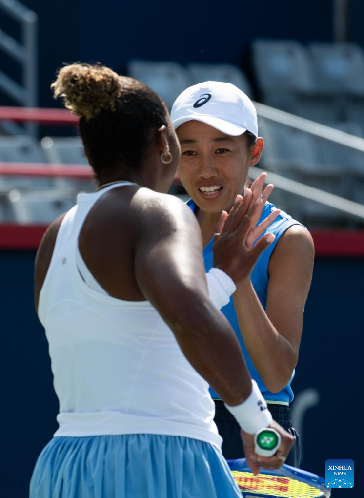 Zhang Shuai (R) and Taylor Townsend encourage each other during the women's doubles final match between Zhang Shuai (China)/Taylor Townsend (the United States) and Coco Gauff/McCartney Kessler of the United States at the 2025 National Bank Open tennis tournament in Montreal, Canada, Aug. 6, 2025. (Photo by Li Haitao/Xinhua)