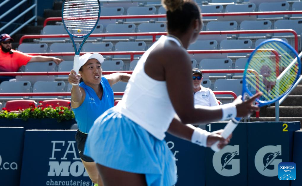 Zhang Shuai (L) /Taylor Townsend return the ball during the women's doubles final match between Zhang Shuai (China)/Taylor Townsend (the United States) and Coco Gauff/McCartney Kessler of the United States at the 2025 National Bank Open tennis tournament in Montreal, Canada, Aug. 6, 2025. (Photo by Li Haitao/Xinhua)