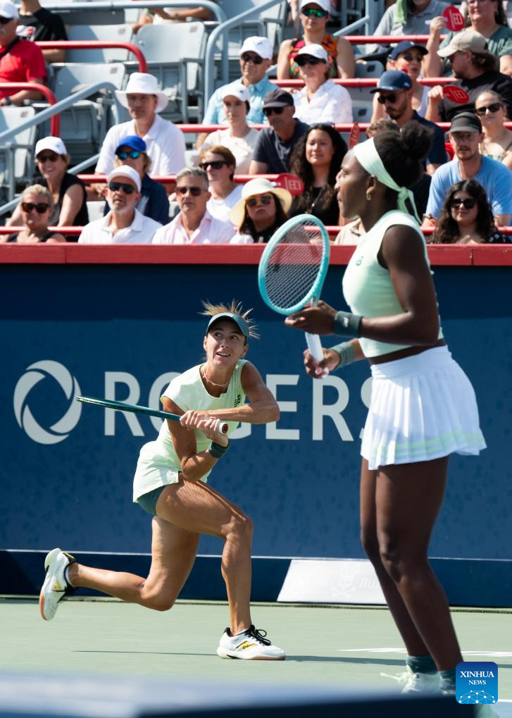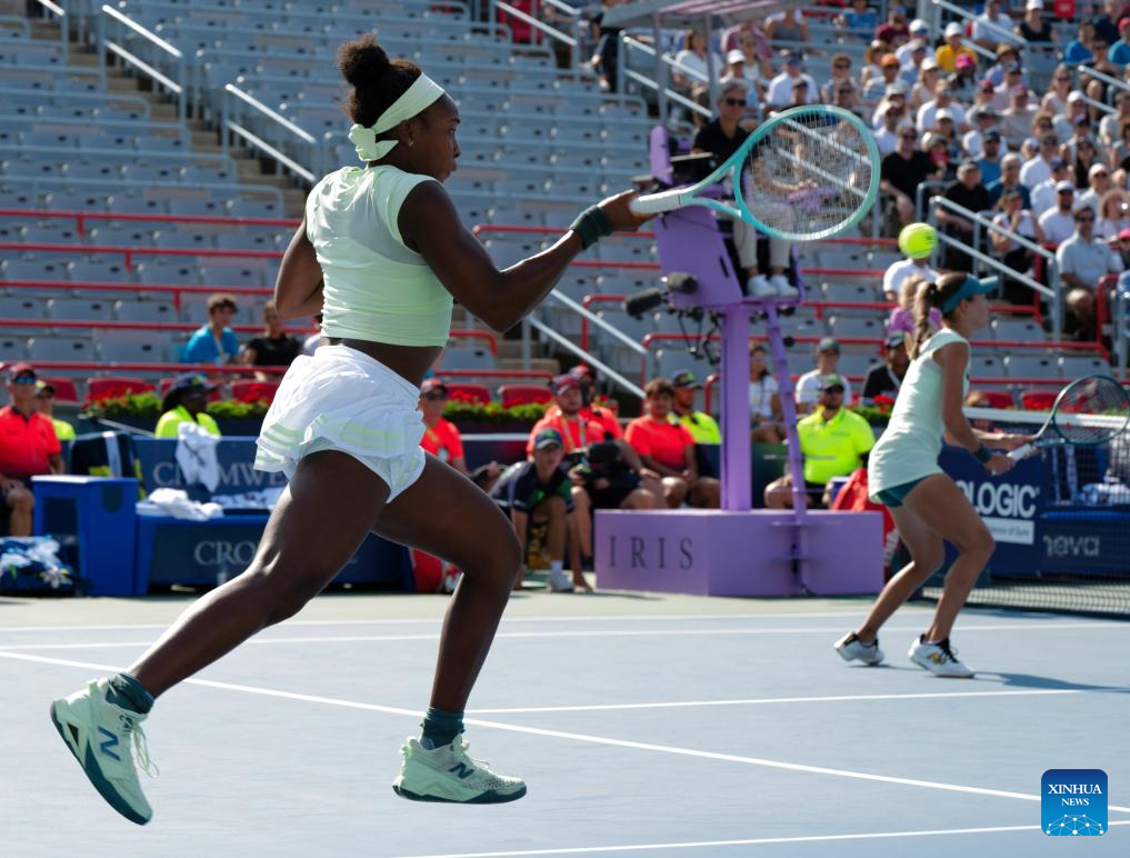Coco Gauff (L) / McCartney Kessler return the ball during the women's doubles final match between Zhang Shuai (China)/Taylor Townsend (the United States) and Coco Gauff/McCartney Kessler of the United States at the 2025 National Bank Open tennis tournament in Montreal, Canada, Aug. 6, 2025. (Photo by Li Haitao/Xinhua)