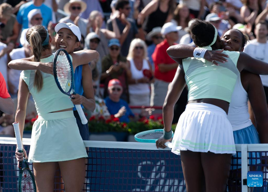 Zhang Shuai (2nd L) / Taylor Townsend (1st R) congratulate Coco Gauff (2nd R) / McCartney Kessler after the women's doubles final match between Zhang Shuai (China)/Taylor Townsend (the United States) and Coco Gauff/McCartney Kessler of the United States at the 2025 National Bank Open tennis tournament in Montreal, Canada, Aug. 6, 2025. (Photo by Li Haitao/Xinhua)