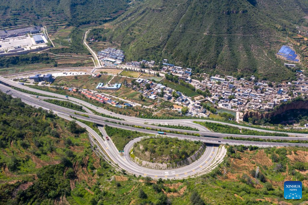 An aerial drone photo taken on Aug. 6, 2025 shows a view of the Taihang Mountain around Hongni Village in Pingshun County, north China's Shanxi Province. Hongni Village has ushered in its peak tourism period. The village, nestled deep in the Taihang Mountains, has a long history and is known as the "ancient village on the cliff."