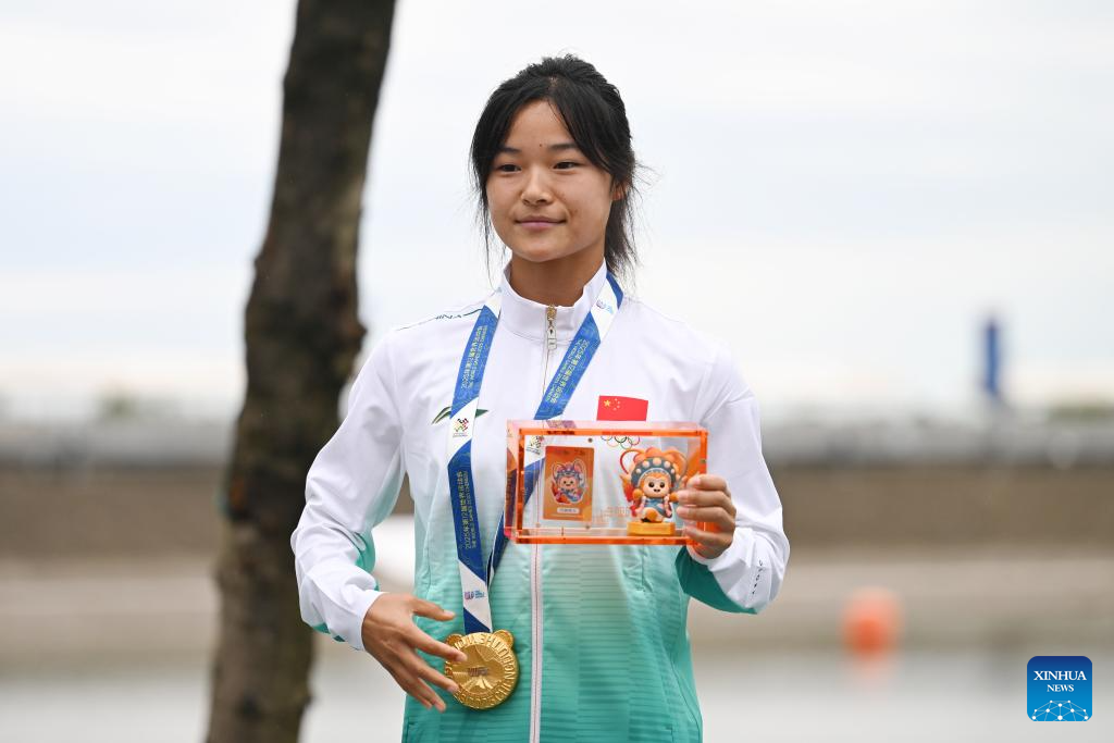 Gold medalist Xu Lu of China poses during the awarding ceremony for the women's wakeboard freestyle of Waterski & Wakeboard event at The World Games 2025 in Chengdu, southwest China's Sichuan Province, Aug. 10, 2025. (Xinhua/Chen Zhenhai)