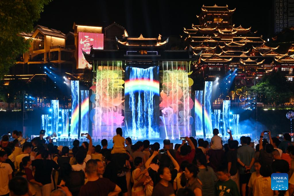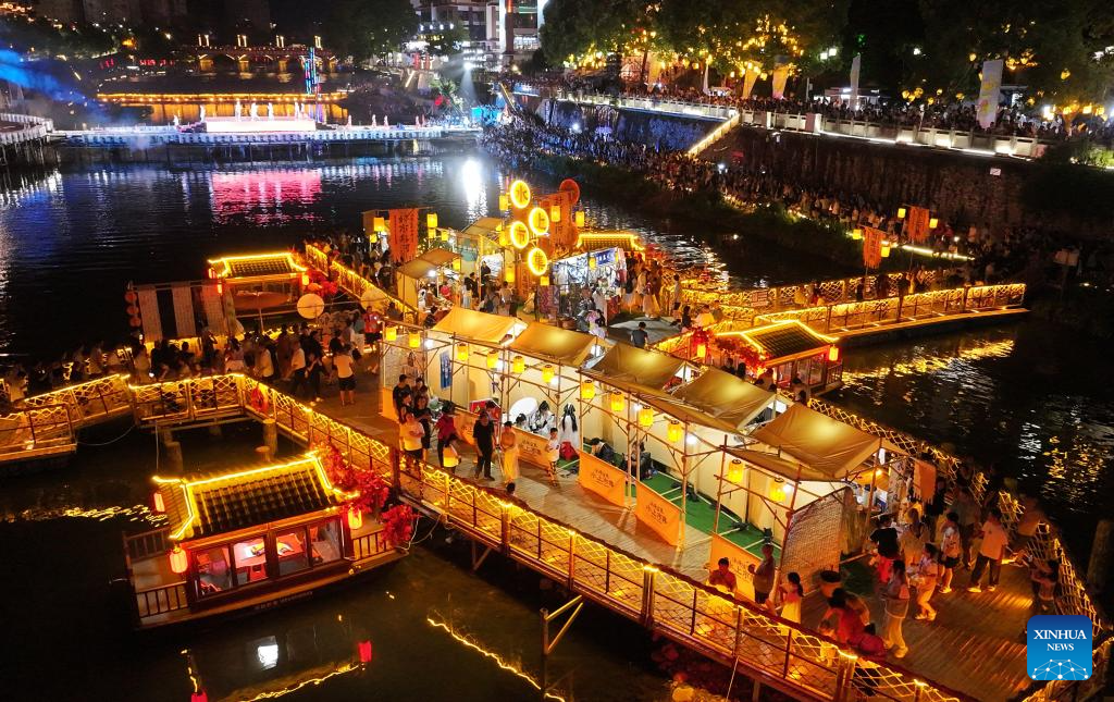 People visit a water market on the Gongshui River in Xuan'en County, Enshi Tujia and Miao Autonomous Prefecture, central China's Hubei Province, Aug. 9, 2025. The water market opened to the public here on Saturday evening. (Photo by Song Wen/Xinhua)