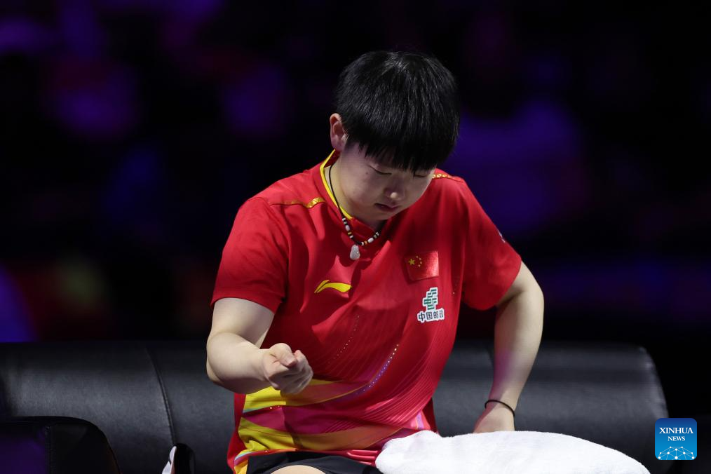 Shi Xunyao (L) of China wipes her face during the women's singles semifinal match between Sun Yingsha of China and Shi Xunyao of China at the WTT Champions Yokohama 2025 in Yokohama, Japan, Aug. 11, 2025. (Xinhua/Jia Haocheng)