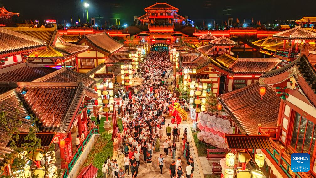 A drone photo taken on Aug. 9, 2025 shows tourists visiting a scenic spot at night in Leling City, east China's Shandong Province. Scenic areas across China have entered peak season for tourism during summer vacation. (Photo by Jia Peng/Xinhua)