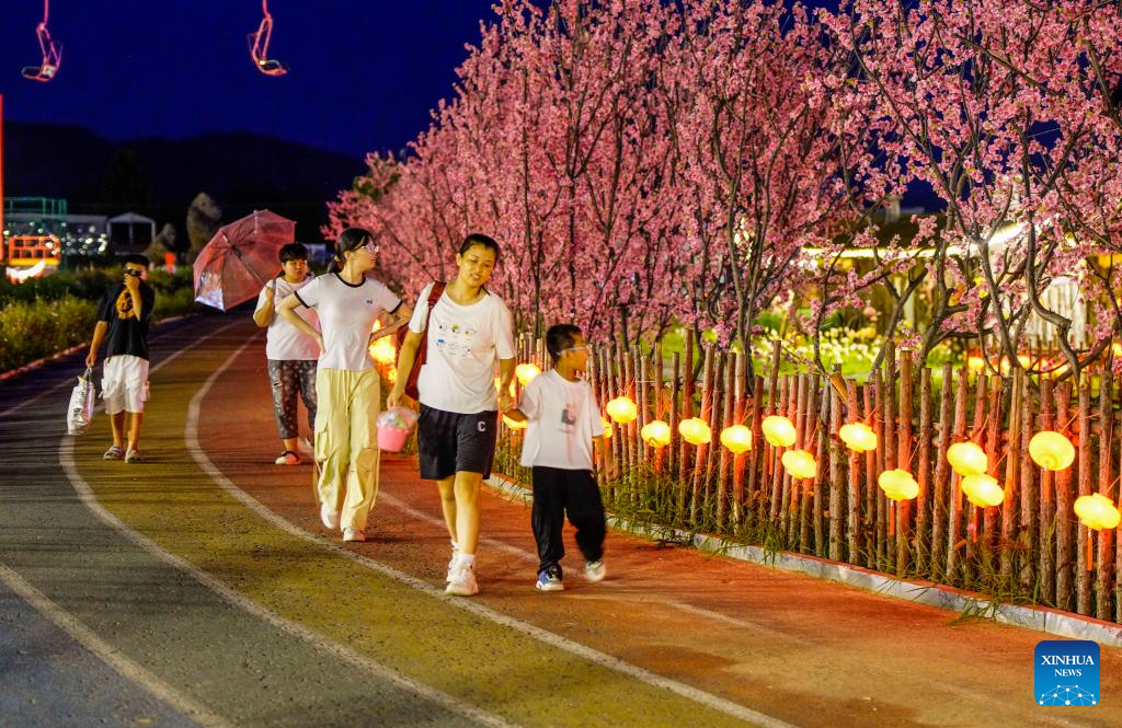 Tourists have fun at a scenic spot at night in Zunhua, north China's Hebei Province, on Aug. 10, 2025. Scenic areas across China have entered peak season for tourism during summer vacation. (Photo by Liu Mancang/Xinhua)