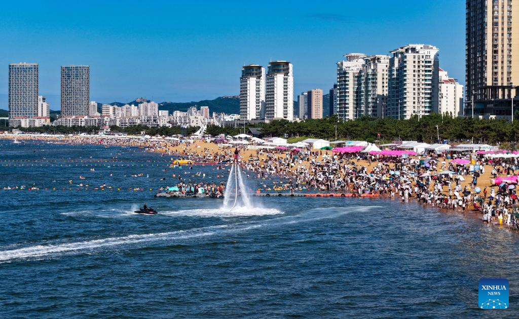 Tourists cool off at a bathing beach of Weihai, east China's Shangdong Province, on Aug. 9, 2025. Scenic areas across China have entered peak season for tourism during summer vacation. (Photo by Zhu Chunxiao/Xinhua)