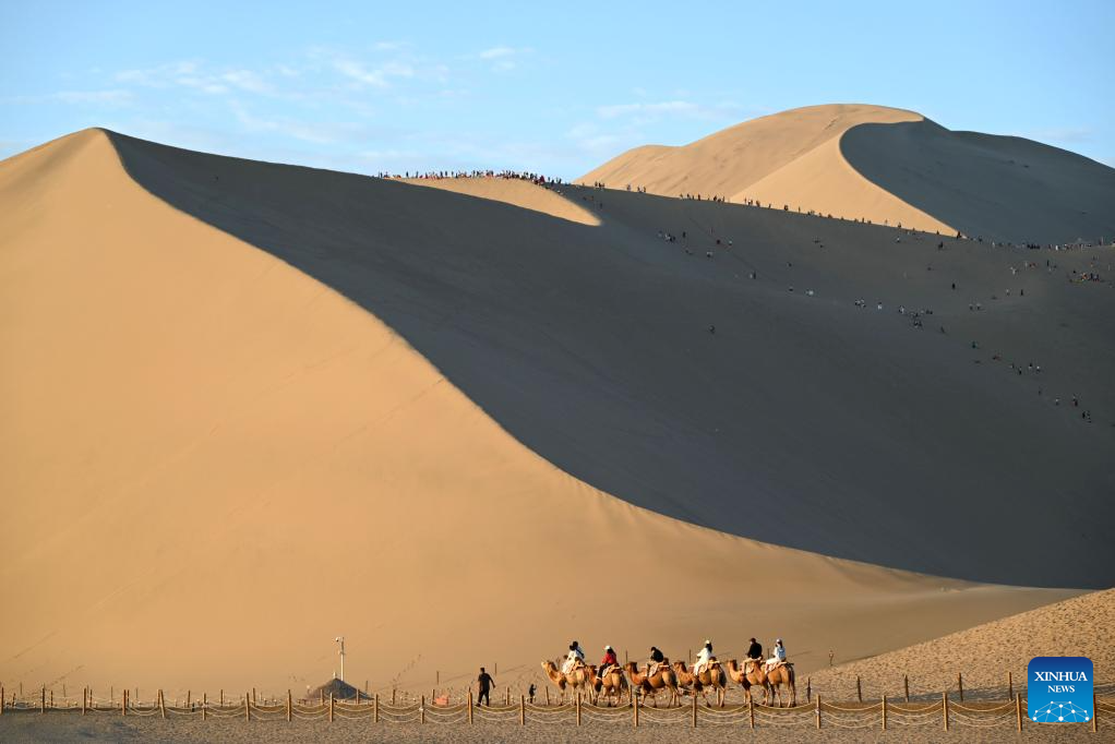 Tourists visit the Mingsha Mountain and Crescent Spring scenic spot in Dunhuang City, northwest China's Gansu Province, on Aug. 9, 2025. Scenic areas across China have entered peak season for tourism during summer vacation. (Photo by Zhang Xiaoliang/Xinhua)