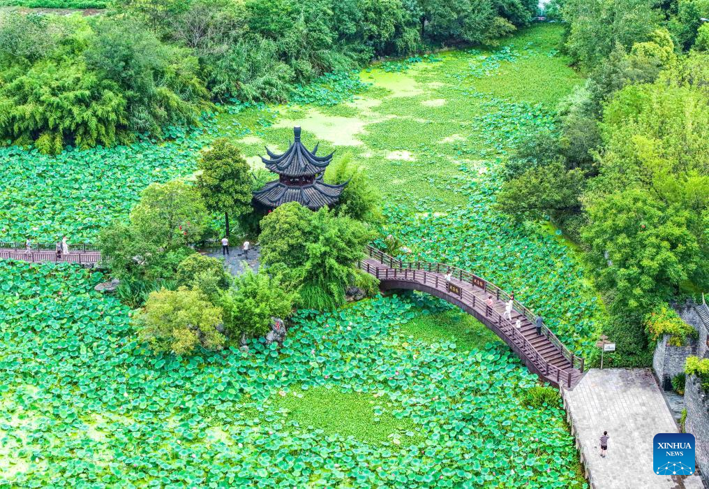 An aerial drone photo taken on Aug. 10, 2025 shows tourists having fun at a garden in Yangzhou, east China's Jiangsu Province. Scenic areas across China have entered peak season for tourism during summer vacation. (Photo by Ren Fei/Xinhua)