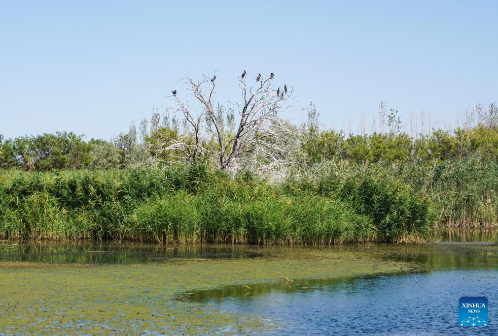 Cormorants rest on branches at the Manas national wetland park in Manas County, Changji Hui Autonomous Prefecture, northwest China's Xinjiang Uygur Autonomous Region, Aug. 10, 2025. In Xinjiang, new wetlands such as the Manas national wetland park and the Lalikun wetland nature reserve have emerged near the border of Gurbantunggut Desert and Taklimakan Desert, acting as important ecological shelters for migrant birds and safeguarding the biodiversity and oases in the region. (Xinhua/Zhou Jiayi)