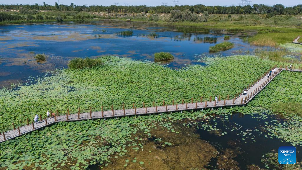 People visit the Manas national wetland park in Manas County, Changji Hui Autonomous Prefecture, northwest China's Xinjiang Uygur Autonomous Region, Aug. 10, 2025. In Xinjiang, new wetlands such as the Manas national wetland park and the Lalikun wetland nature reserve have emerged near the border of Gurbantunggut Desert and Taklimakan Desert, acting as important ecological shelters for migrant birds and safeguarding the biodiversity and oases in the region. (Xinhua/Zhou Jiayi)