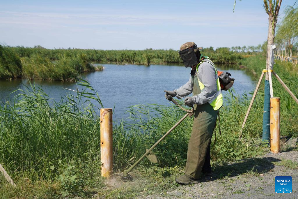 A worker cleans weed at the Manas national wetland park in Manas County, Changji Hui Autonomous Prefecture, northwest China's Xinjiang Uygur Autonomous Region, Aug. 10, 2025. In Xinjiang, new wetlands such as the Manas national wetland park and the Lalikun wetland nature reserve have emerged near the border of Gurbantunggut Desert and Taklimakan Desert, acting as important ecological shelters for migrant birds and safeguarding the biodiversity and oases in the region. (Xinhua/Zhou Jiayi)
