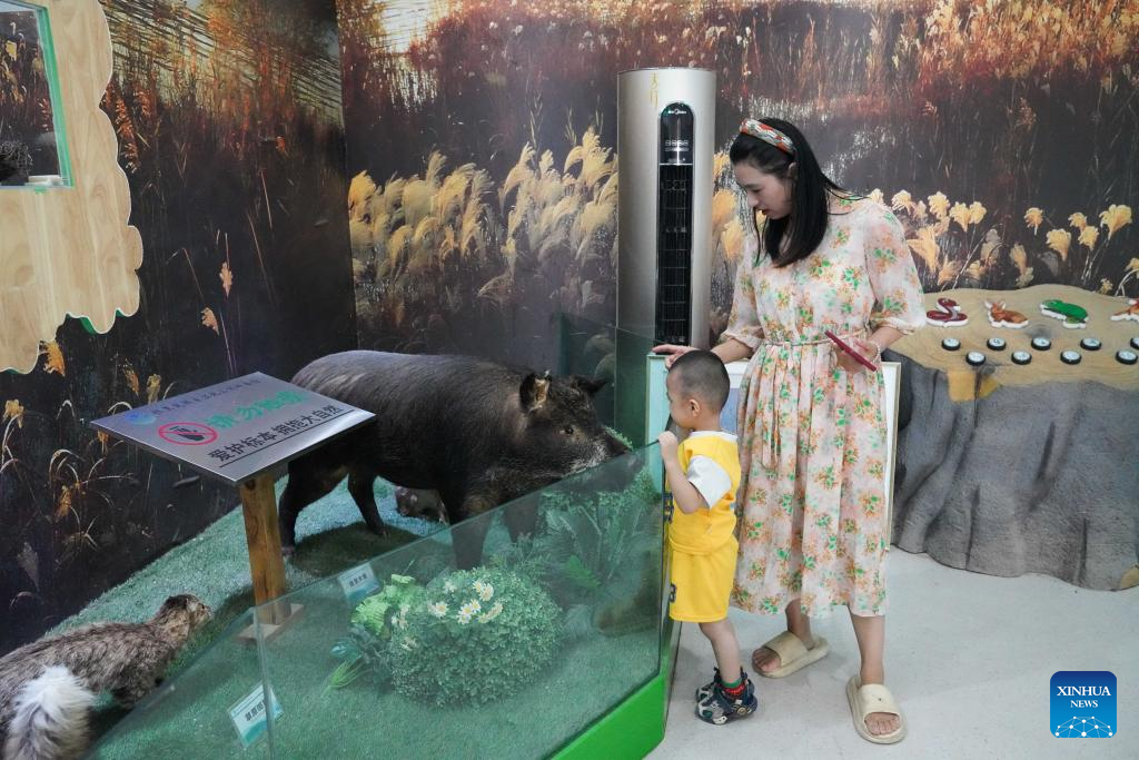 People visit an exhibition hall at the Lalikun wetland nature reserve in Moyu County of Hotan Prefecture, northwest China's Xinjiang Uygur Autonomous Region, Aug. 6, 2025. In Xinjiang, new wetlands such as the Manas national wetland park and the Lalikun wetland nature reserve have emerged near the border of Gurbantunggut Desert and Taklimakan Desert, acting as important ecological shelters for migrant birds and safeguarding the biodiversity and oases in the region. (Xinhua/Zhou Jiayi)